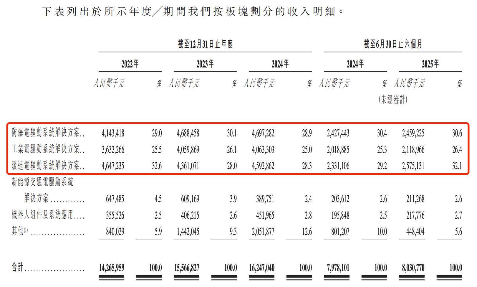 其中,防爆、工业、暖通电驱动系统解决方案这三大业务为卧龙电驱的基础业务板块,贡献了公司近九成营收。报告期内,三大业务板块收入占比高达87.1%、84.2%、82.2%、89.1%。